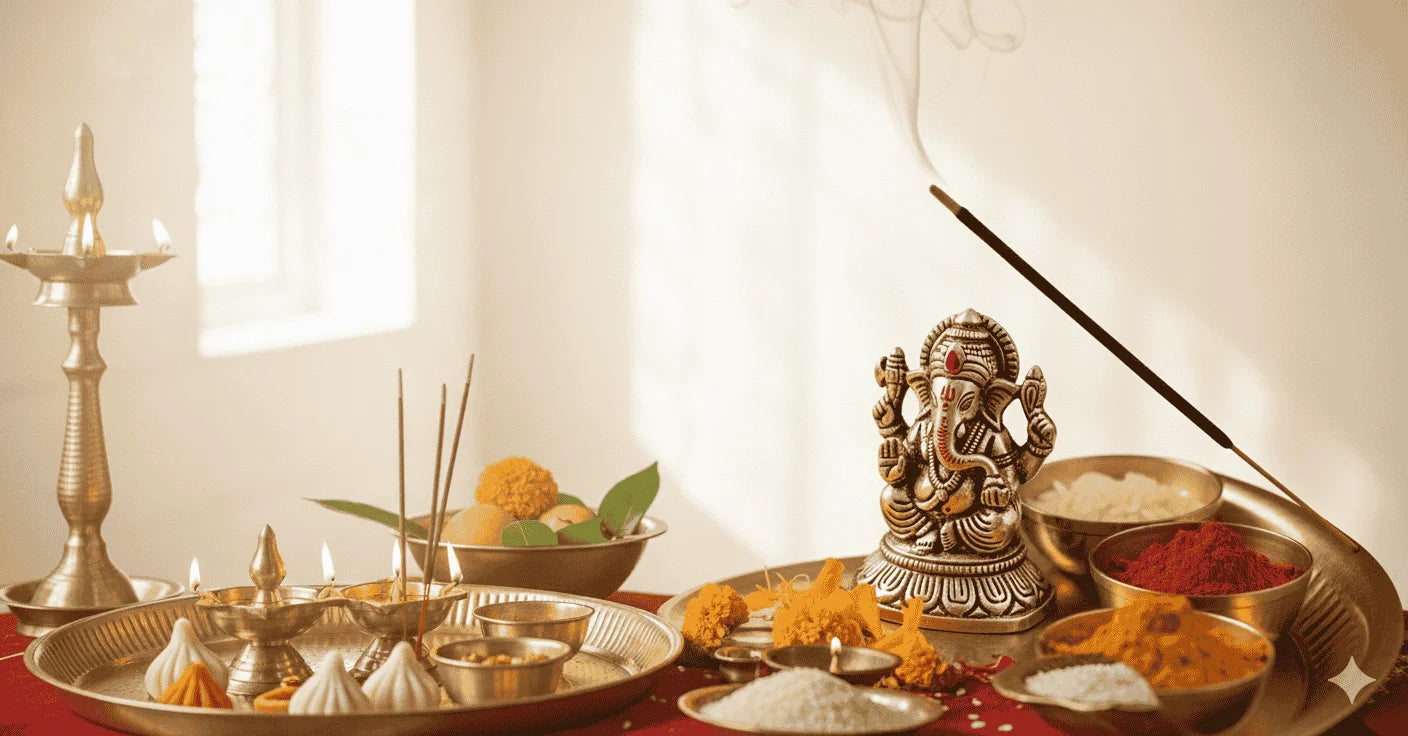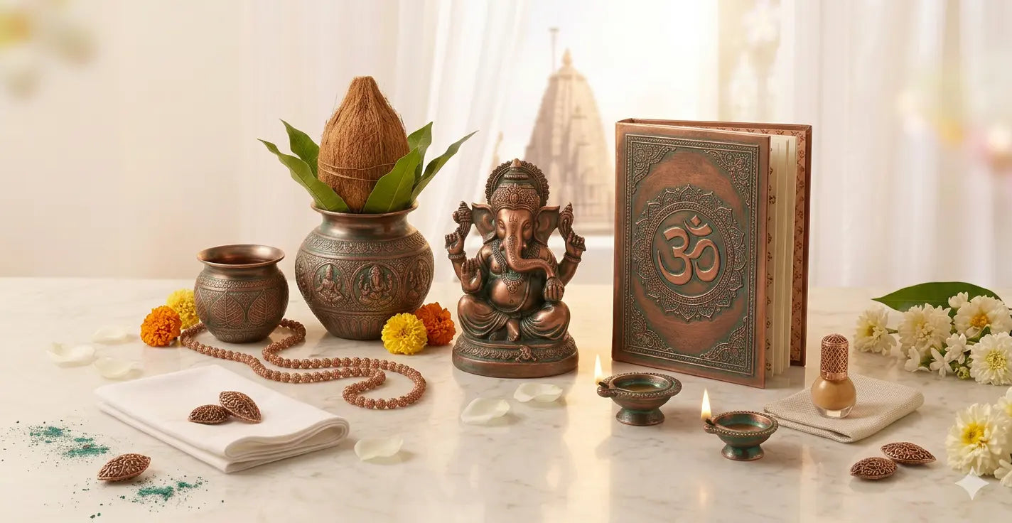 A basic home puja typically requires a brass diya (lamp), an agarbatti (incense) holder, a bell, and a small idol of your deity. Adding a copper plate for offerings and a fresh flower pot or urli can further enhance the sacred energy of your altar.