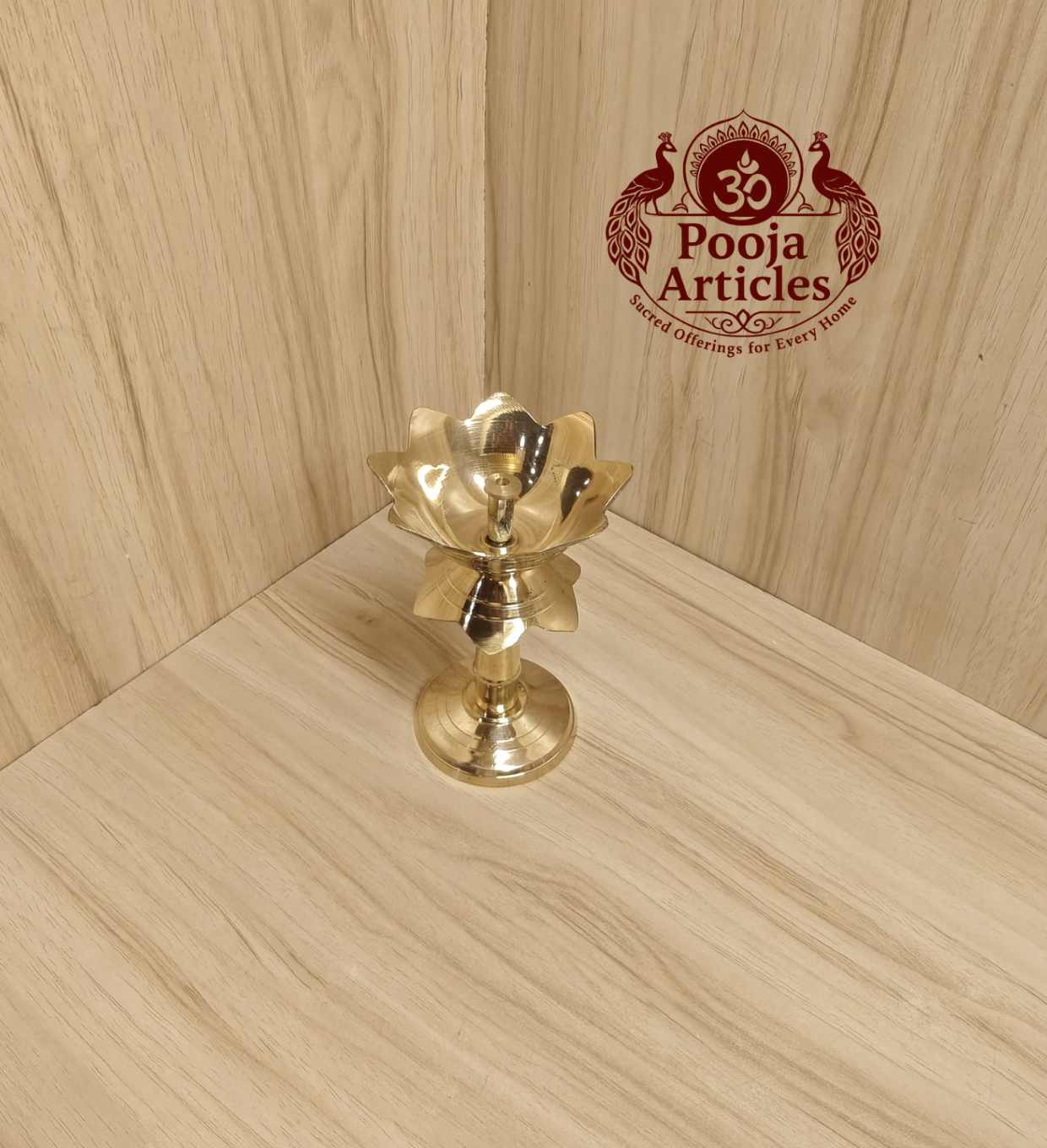 Illuminate your pooja space with the exquisite Brass Diya Stand Lotus —150 grams, 4.7-inch handcrafted oil lamp shaped like a sacred lotus flower. Perfect for temple altars, spiritual décor, and gifting. Shop authentic Brass Lotus Diyas at poojaarticles.com for divine light and tradition.