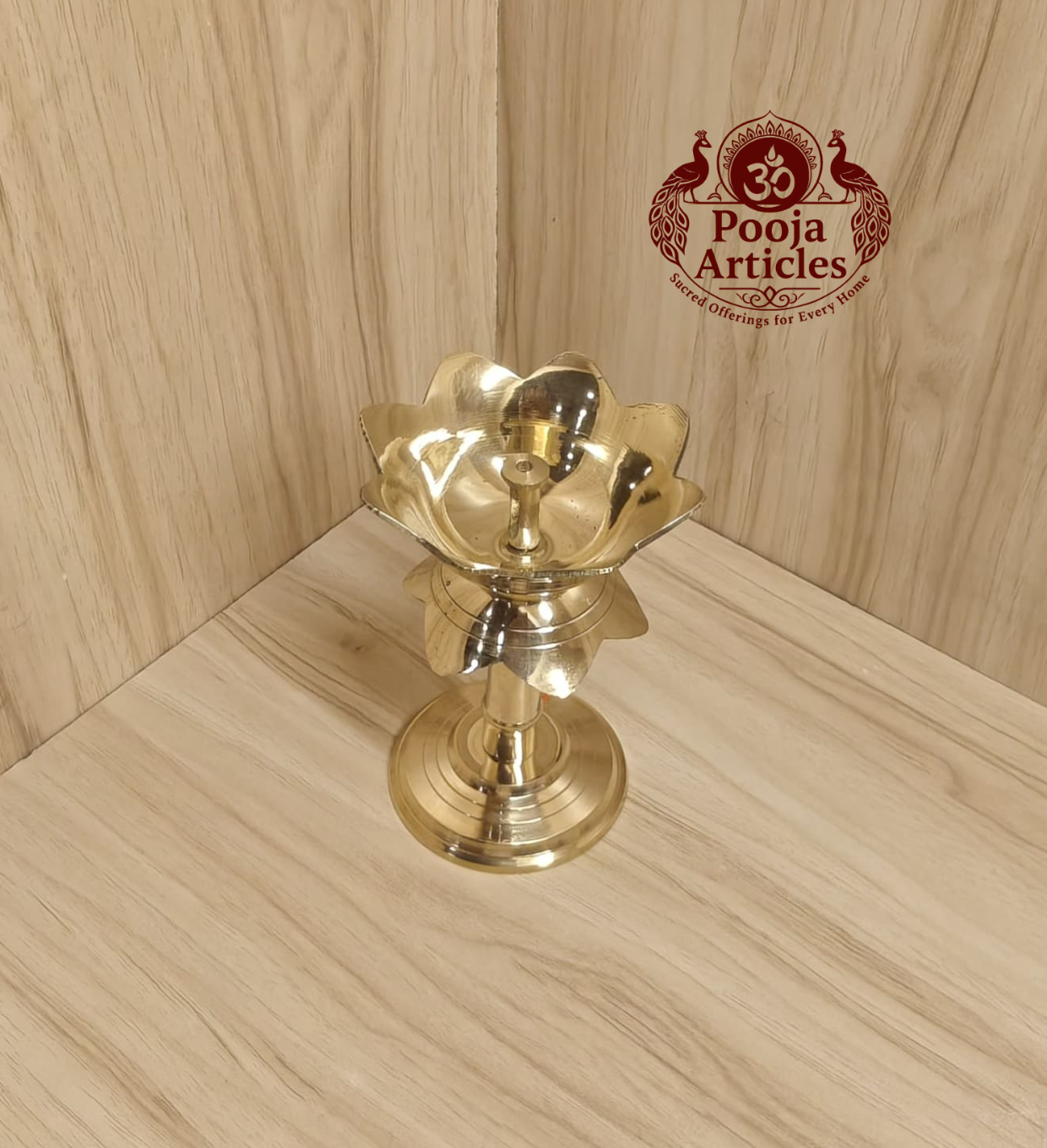 Illuminate pooja rituals with the Brass Diya Stand Lotus—230 grams, 6-inch handcrafted oil lamp inspired by the sacred lotus flower. Ideal for temple mandirs, home altars, and gifting. Shop authentic Brass Lotus Diyas at poojaarticles.com for divine illumination and spiritual legacy.