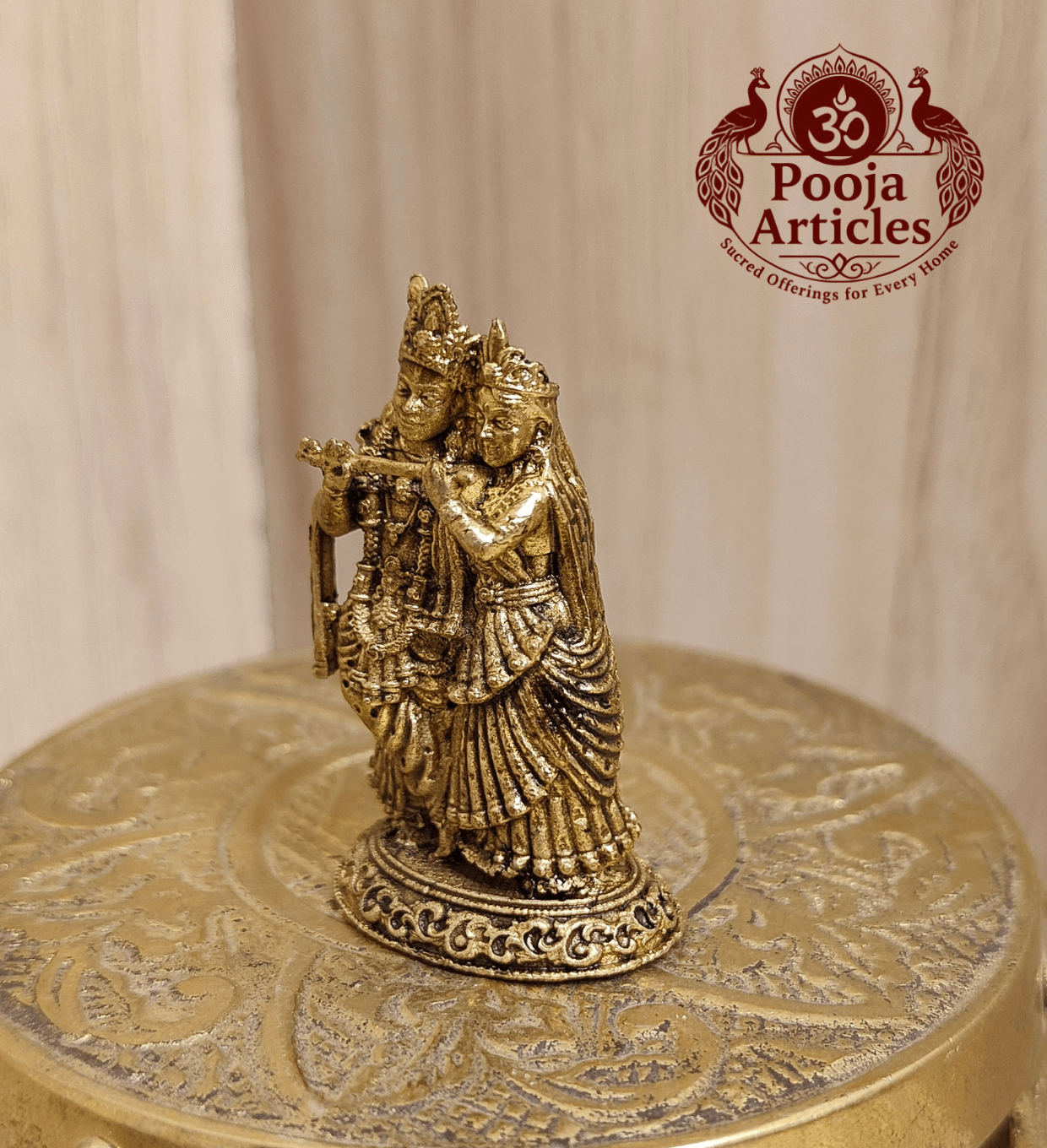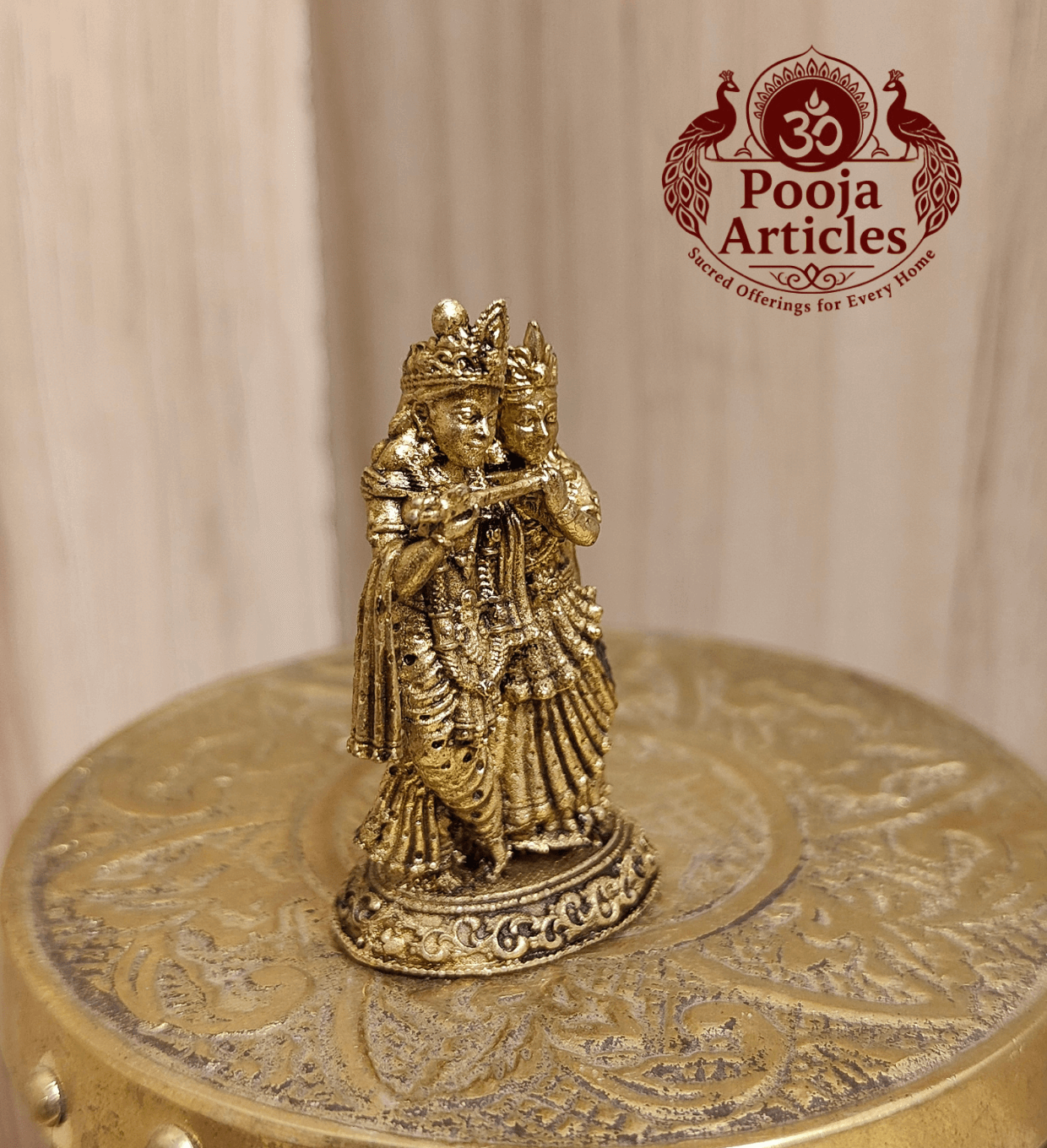 Shop Premium Brass Radha Krishna Statue online. Compact 35 gram idol with 1.7 inch height, perfect for home pooja, vastu harmony, spiritual décor and gifting. Buy authentic brass deity idols at poojaarticles.com.