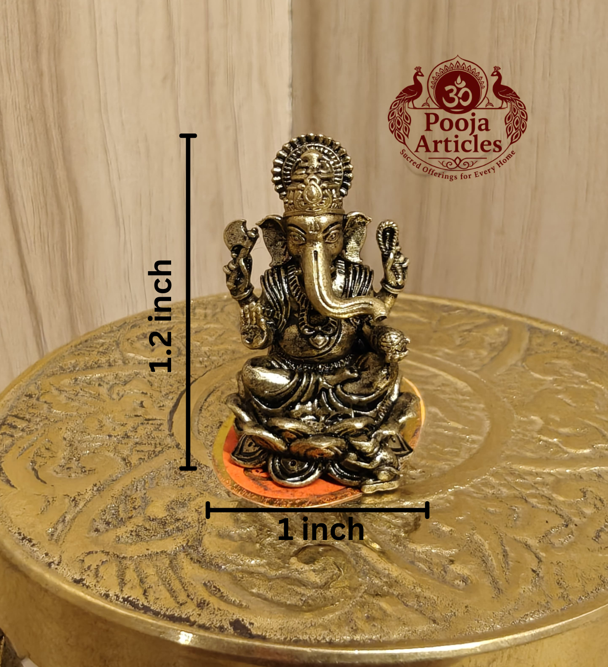 Buy Miniature Ganesh Idol Online – 20 g handcrafted brass idol (1.2″ height), ideal for home temples, travel shrines, and auspicious gifting. Shop now at poojaarticles.com.