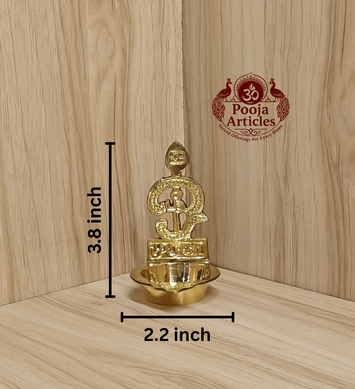 Explore the Om Vilakku (60g, 3.8 x 2.2 x 2.6 in) – a handcrafted divine brass diya that brings spiritual light and positivity. Buy online at poojaarticles.com.