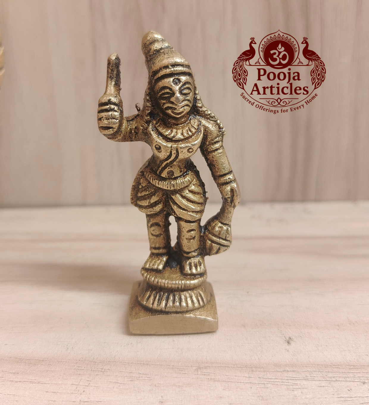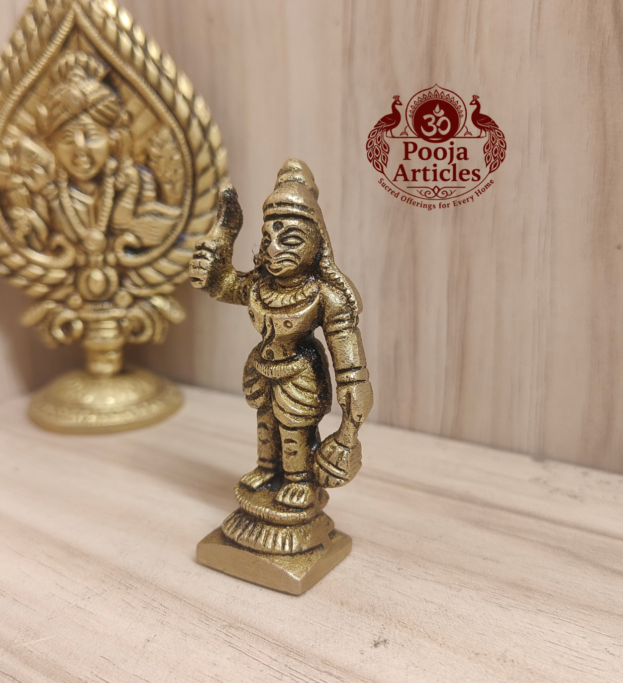 Embrace the protective energy of Lord Karuppasamy with this powerful handcrafted Karuppasamy brass statue. Its compact size, coupled with intricate detailing, makes it a perfect embodiment of devotion and artistry. Invite divine justice and protection into your life by adding this sacred idol to your spiritual collection.