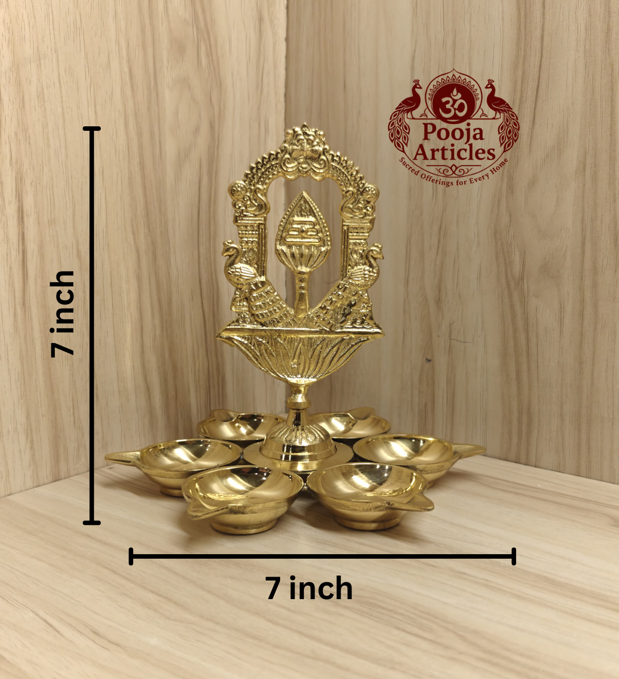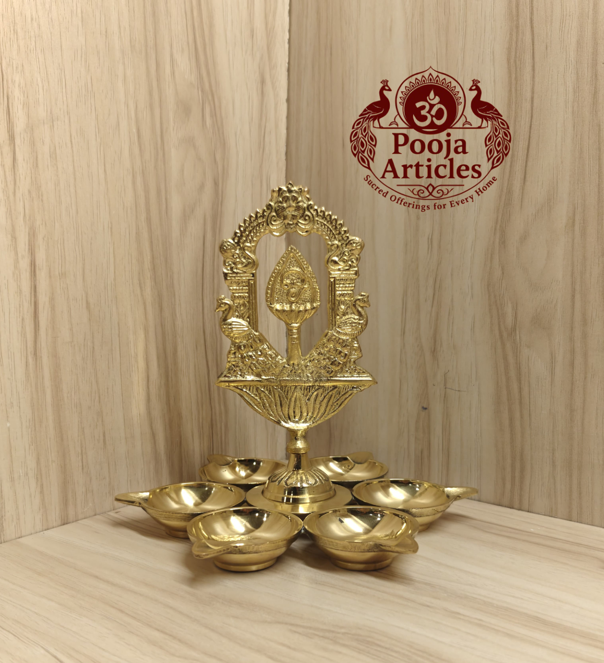 Buy premium Tiruvachi Vel Arumuga Vilakku and Arch Vel Diya online at PoojaArticles.com – 390g brass lamp, 7″ height, 7″ length, 7″ breadth. Handcrafted for divine elegance, perfect for Murugan pooja, temple décor, and spiritual gifting. Fast delivery across India.
