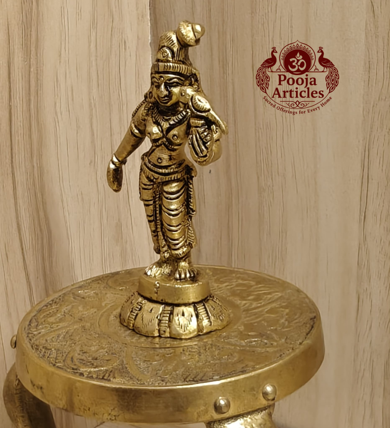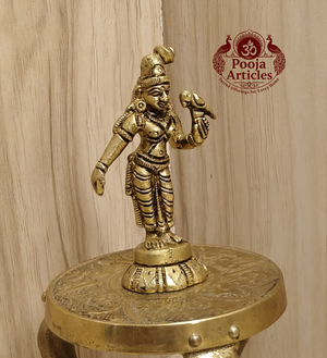 This beautifully handcrafted Brass Andal Idol features a compact and elegant divine representation of Goddess Andal (Godha Devi) with a serene expression. Weighing 90 grams with dimensions of 3 inch (H) × 1.1 inch (L) × 1 inch (B), it features a polished brass finish with a subtle antique tone. Ideal for home temples, Margazhi month, and auspicious gifting.